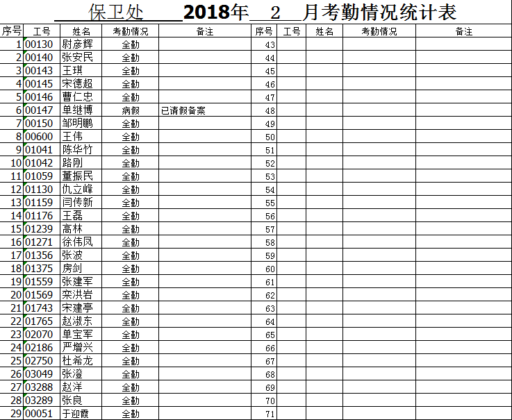 保卫处 2018年 2 月考勤情况统计表