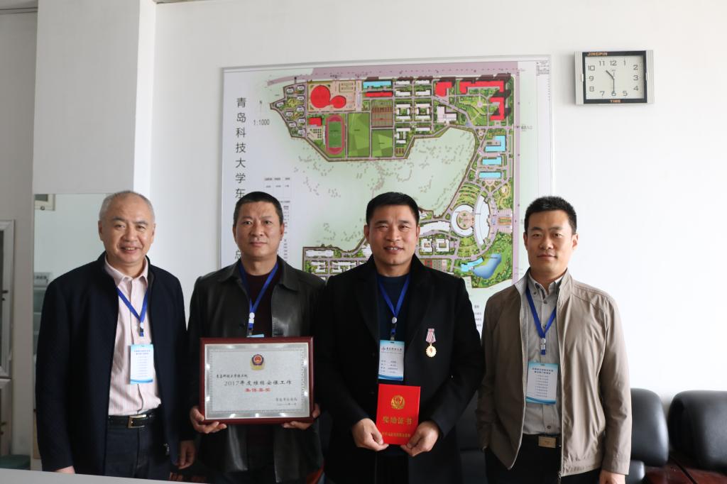 近日,山东省公安厅和青岛市公安局分别下发文件,通报表彰了在2017年省市高校文化单位先进保卫组织和先进个人。4月3日上午,青岛市公安局国保支队张荣增副支队长一行三人,代表公安机关专程来校宣读了表彰通报,我校李勇副校长被山东省公安厅表彰为先进个人,记个人二等功一次,保卫处荣记集体嘉奖一次,交通技防科闫传新记三等功一次,校卫队房剑和消防科仇立峰分别记个人嘉奖一次。