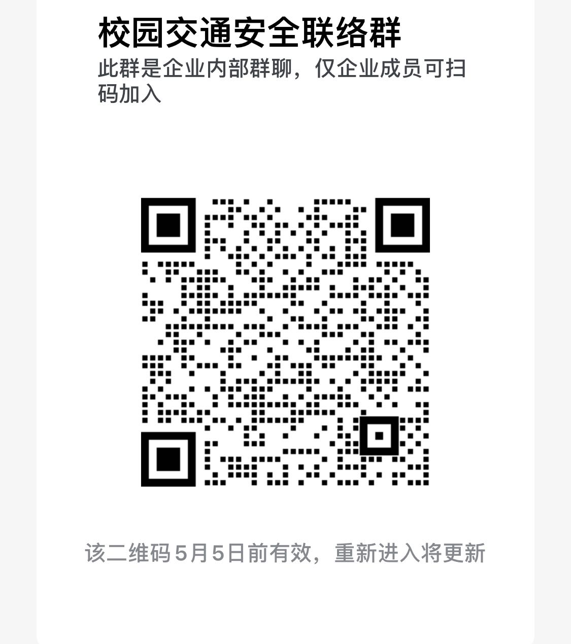 3.及时沟通协调。请各学院明确一位安全宣传员负责单位内的宣传联络工作,并于5月1日前加入企业微信“校园道路交通安全群”(见二维码)。保卫安全专班将加强与各单位保持联系,及时反馈有关信息,确保专项整治期间各类问题得到有效妥处。各专班、各单位有关安全教育落实情况以及合理建议,请及时报送保卫处。