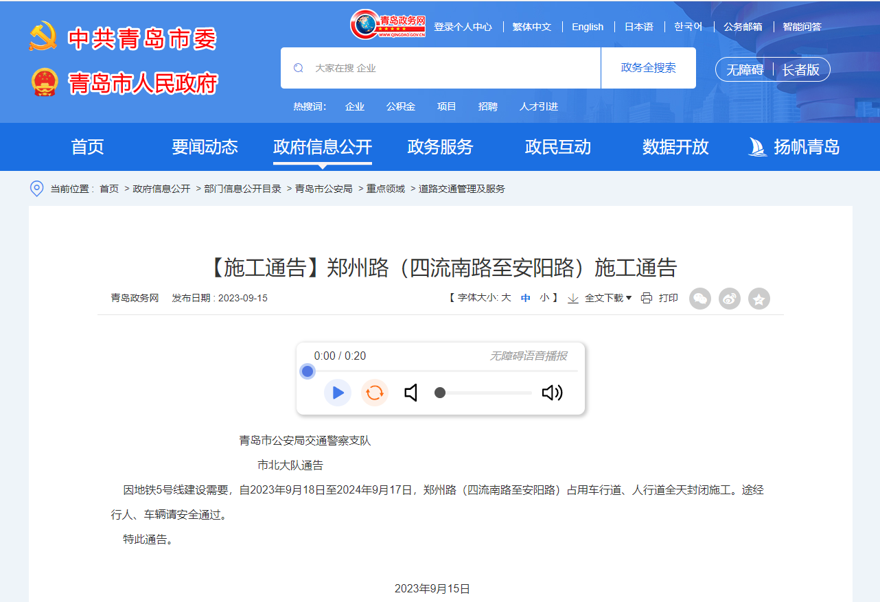今转发青岛市公安局交通警察支队市北大队【施工通告】请知悉,因为地铁施工,郑州路安阳路交界口以西至四流中路路口目前已经封闭,进出四方校区请提前安排好路线。