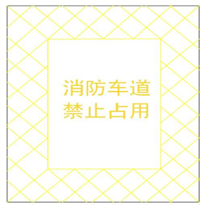 (四)在单位或者住宅区的消防车通道出入口路面,按照消防车通道净宽施划禁停标线,标线为黄色网状实线,外边框线宽20厘米,内部网格线宽10厘米,内部网格线与外边框夹角45度,标线中央位置沿行车方向标注内容为“消防车道禁止占用”的警示字样。禁停标线长宽不小于2m×1.5m(若受条件限制,无法满足醒目度要求,应按4:3比例加大标志的尺寸)。