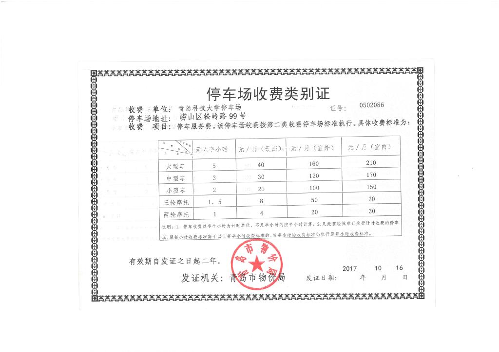 beat365英国官方网站停车场收费类别证(2017-2019)