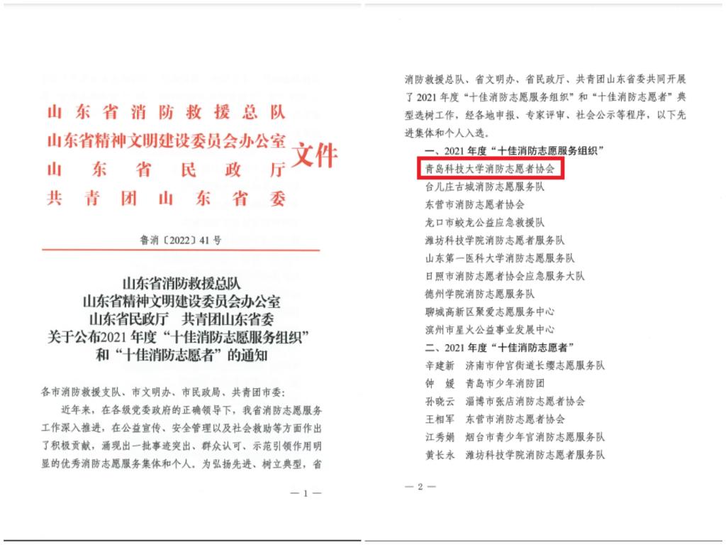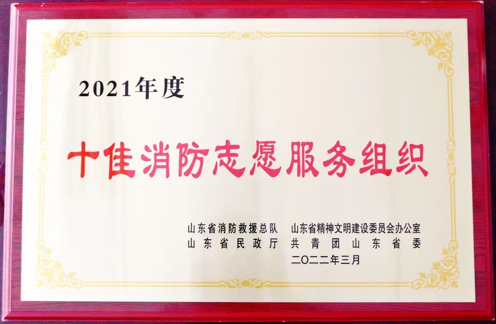 日前,由山东省消防救援总队、山东省精神文明建设委员会办公室、山东省民政厅、共青团山东省委联合开展的全省消防志愿服务典型选树工作中,我校保卫处指导的消防志愿者协会经单位申请、专家评审、社会公示等环节,以全省排名第一的成绩,荣获“2021年度十佳消防志愿服务组织”称号。