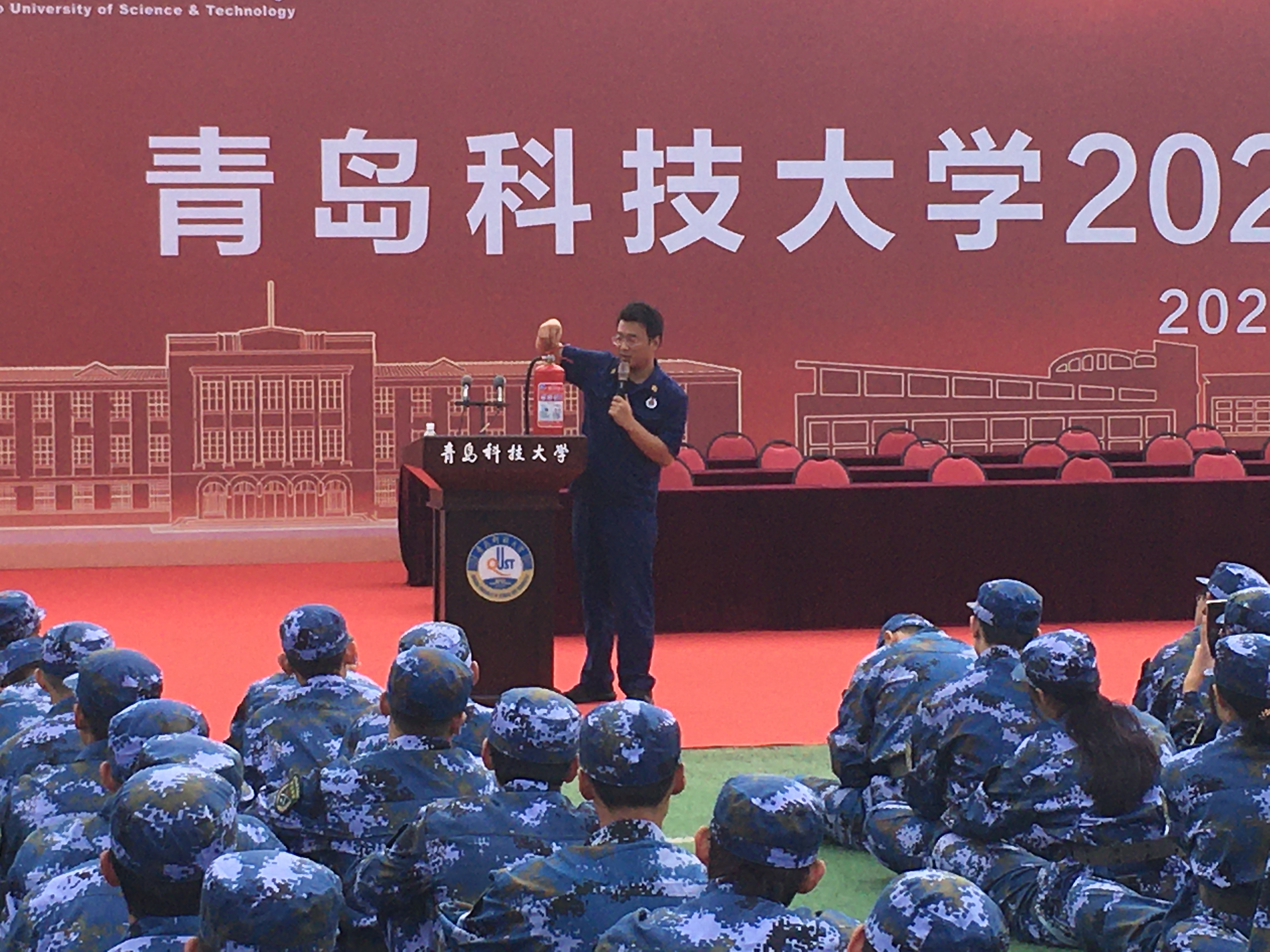 “小火快跑、浓烟关门”,崂山消防大队孙斌参谋通过对常见校园火灾事故案例的总结为切入点,深入浅出的向现场的新生普及校园火灾预防措施、扑救初期火灾的方法、逃生知识和安全技能,带领大家亲身体验火场逃生方法,识别校园内的消防设施设备,并介绍其使用方法。