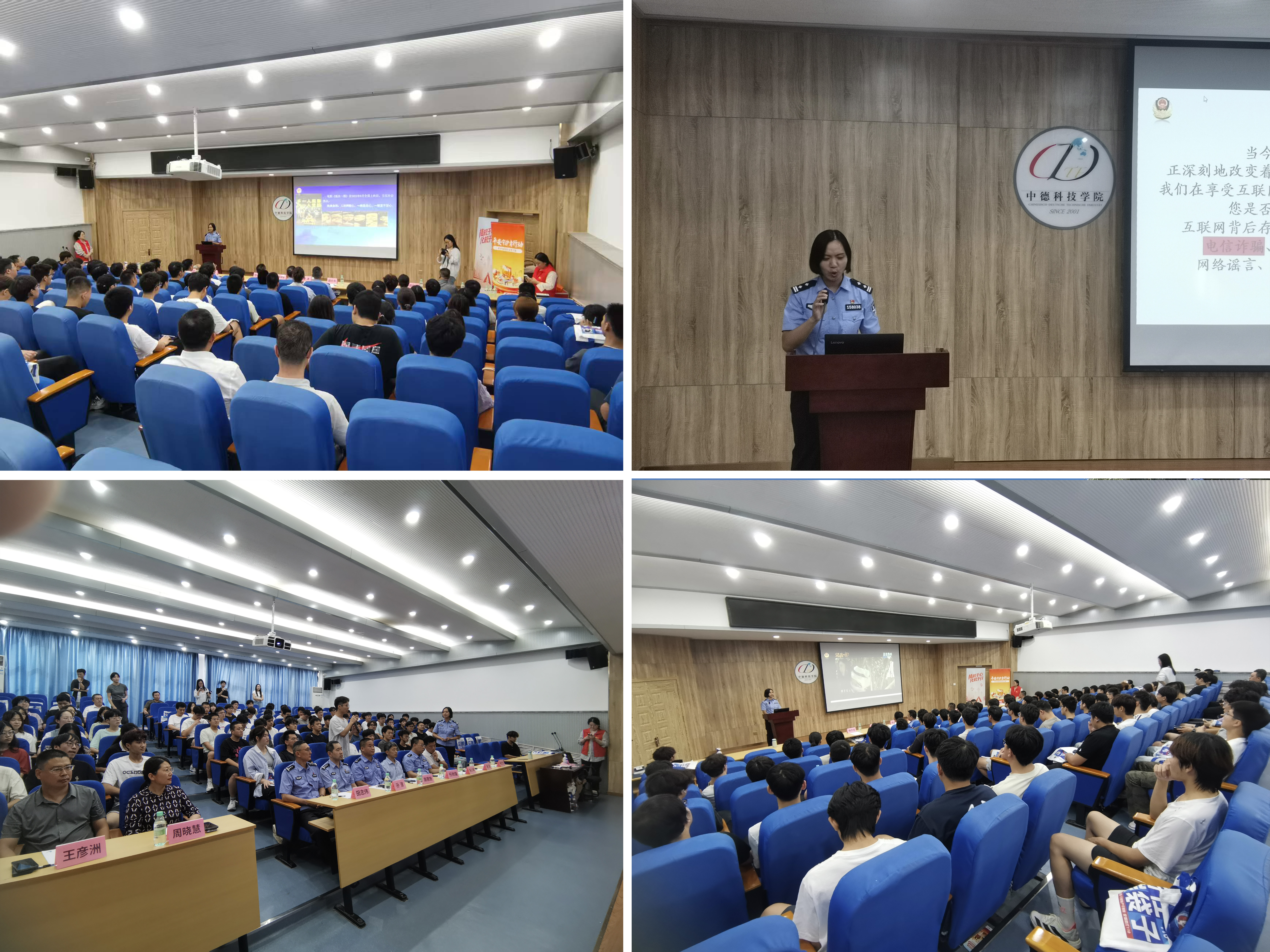 同时,在中德科技学院举办了防范电信网络诈骗专题授课。来自青岛市公安局崂山公安分局的刘梅贞警官以《反诈是门必修课,筑牢防线守好责》为题,从“什么是电信诈骗”“电信网络诈骗的常见种类”“如何识别与防范电信诈骗”等方面,通过剖析真实诈骗案例、有奖竞答等方式,为学生们带来了一场生动而深刻的金融安全教育,引导大家增强识别风险的能力,避免成为电信诈骗的工具。整个现场,学生们踊跃参与,积极回答问题,现场气氛热烈活跃,切实营造了“学习反诈知识、防范金融风险”的浓厚氛围。