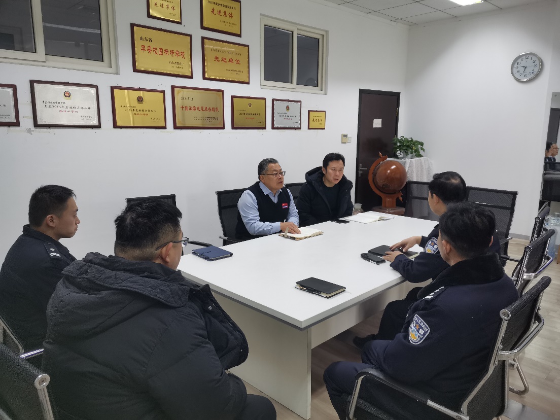 会上,王永波对调研组一行的到来表示欢迎,对崂山治安大队长期以来的关心与指导表示感谢,并就学校beat365英国官方网站体系建设及运行和近期成效向调研组作了简要介绍。