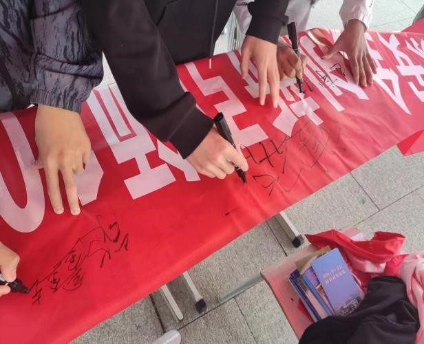 同时,活动现场铺展了大型横幅,上面印有“总体国家安全观,创新引领10周年”等标语。参与者们纷纷踊跃签名,在横幅上留下自己的名字和对国家安全的支持宣言。这些签名将成为反邪教协会未来宣传活动的重要组成部分,彰显了大学生们对于维护国家安全的责任感和决心。