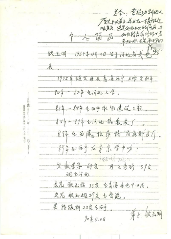 ▲为了学习“中功”,狄玉明于1990年5月11日自拟了一份个人简历。“中功”某陈姓核心骨干后来在上面批注:“菩提功创始人原是中功弟子,并且在一楼做过服务员。这是他自拟的简历,与他自称青海修炼十多年相比,正是不打自招。”