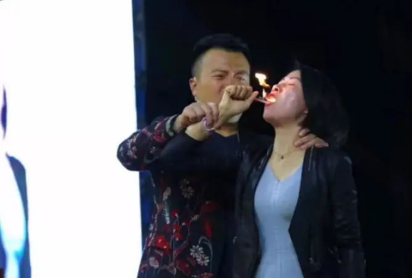 女学员能口吞火把、脚踩火炭